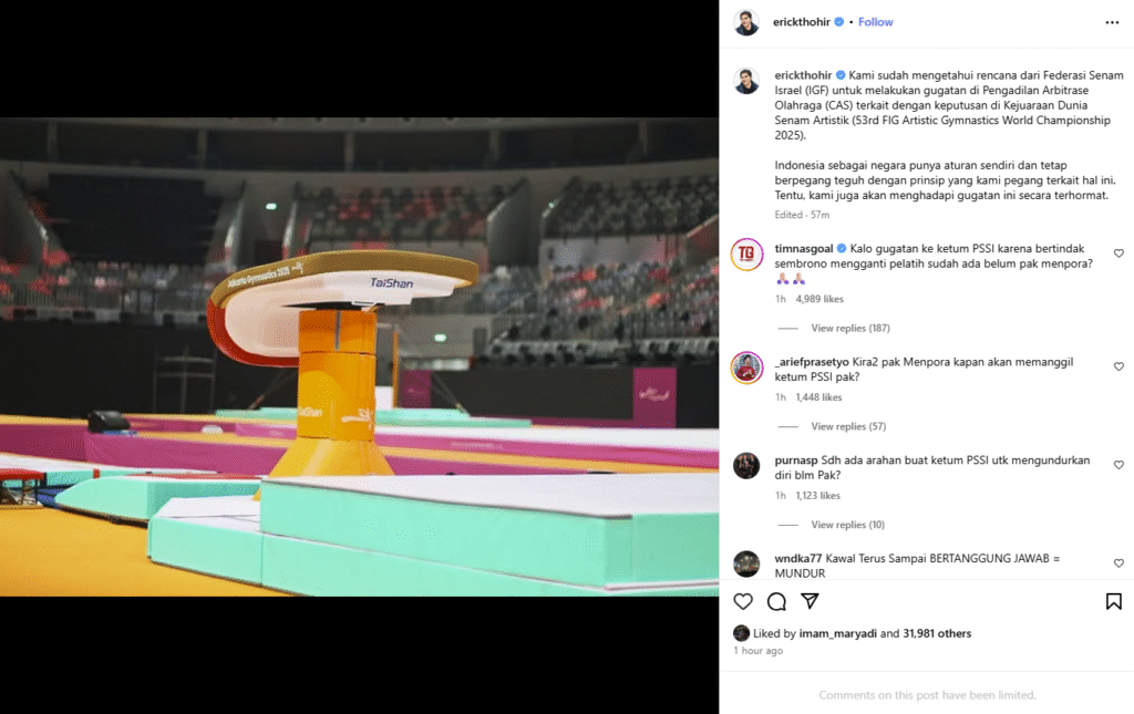 “Kami sudah mengetahui rencana dari Federasi Senam Israel (IGF) untuk melakukan gugatan di Pengadilan Arbitrase Olahraga (CAS) terkait dengan keputusan di Kejuaraan Dunia Senam Artistik 2025,” ujar Erick dalam unggahan di Instagram pribadinya.