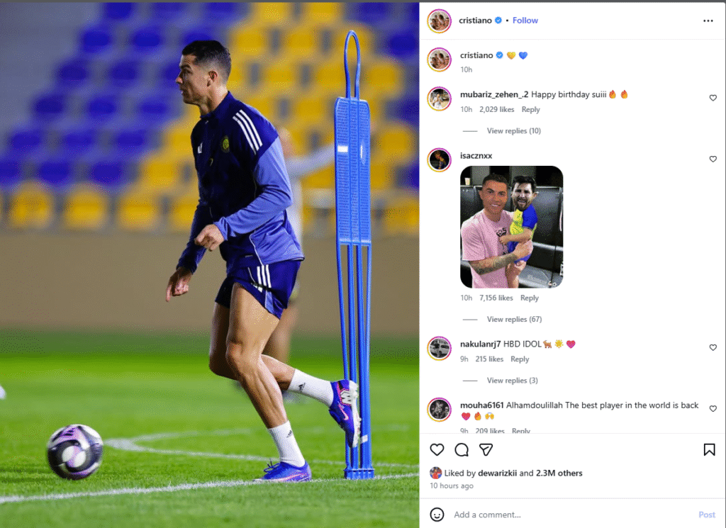 Jika sebelumnya, Ronaldo mogok main untuk Al Nassr, dikarenakan marah kepada pengelola dana kekayaan publik Arab Saudi atau Public Investment Fund (PIF). Baru-baru ini, di media sosialnya (5/2/2026), Ronaldo membagikan foto sedang berlatih di Al Nassr. Emoji hati biru dan kuning, warna khar Al Nassr turut dibubuhkan dalam postingannya.