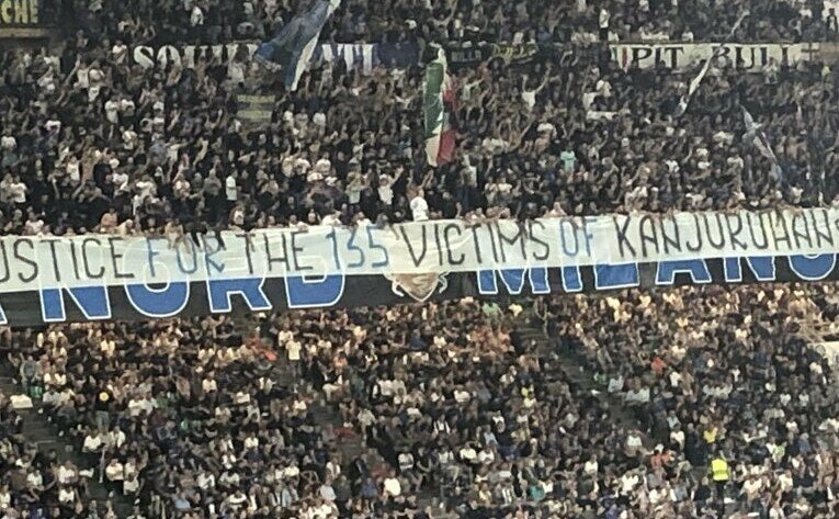 iMSPORT.TV - Kelompok suporter Inter Milan, Curva Nord membentangkan spanduk besar bertuliskan usut tuntas tragedi Kanjuruhan, saat laga Inter Milan vs Benfica di Liga Champions yang berlangsung di Stadion Giuseppe Meazza pada Rabu (4/10/2023) dini hari WIB.